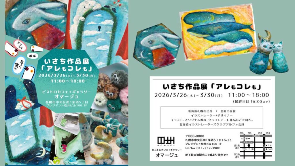 ✨ 3月個展のお知らせ — いさち作品展「アレとコレと」 いさち作品展「アレとコレと」 📅 会期2026年3月26日(木)〜 3月30日(月)11:00〜18:00 📍 会場ビストロ+カフェギャラリー オマージュ(札幌) 展示について 春恒例となった、いさちの個展「アレ... -